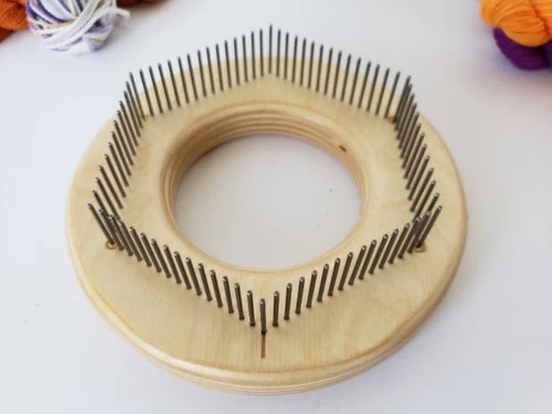 The loom is made of quality Baltic Birch plywood, finished beautifully with two coats of traditional clear Shellac, sealed with satin polyurethane. The hexagon weaving area measures about 4” side-to-side, and each of the six hexagon sides measures a little over 2”.